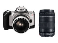 | Tipo de cámara | Cámara SLR | Anchura | 13 cm | Profundidad | 6.4 cm | Altura | 9 cm | Peso | 365 g | | Formato de cámara | 35mm | Margen de exposición | 1/4000 seg - 30 seg | Modos de exposición | Programa, flash programable TTL, flash programable con la función de medición A-TTL, profundidad de campo, lámpara, automático, manual, prioridad de abertura, prioridad de velocidad, programa flash E-TTL II | Medición de la exposición | De evaluación, parcial (9.5%), compensado en el centro | Detalles del rango de exposición | EV 1-20 ( ISO 100 ) | Compensación de exposición | ±2 rango de EV, en pasos EV de 1/2 | Zonas de medición de la exposición | 35 | Rango de exposición automática | 3 pasos en paso EV de 1/2 | Exposición múltiple | 9 exposiciones por cuadro | Velocidad de sincronización X | 1/125 de segundo | Control de obturación | Electrónico | Modos de toma de fotografías | Completamente automático, acercamiento del primer plano, night portrait, horizontal, vertical, nocturno, deportes | Foco automático | TTL phase detection | Modos del foco automático | Toma individual, automático, continuo | Puntos (zonas) de foco automático | 7 | Rango de funcionamiento del foco automático | EV 1-20 | Gama de velocidades de la película | ISO 6 - 6400 | Avance de la película | Automático | Velocidad continua del disparador | 3 cuadros por segundo | Funciones del temporizador | Temporizador automático | Demora del temporizador automático | 10 seg | Iluminación de pantalla LCD de estado | Sí | Información de la pantalla de cristal líquido | Modo de enfoque automático, velocidad de obturación, contador de cuadros, apertura, reducción del efecto de ojos rojos, modo de temporizador automático, velocidad de la película, accionamiento continuo, indicador de control remoto, compensación de exposición, Modo de medición, estado de la pila, programa, modo del flash | Control remoto | Opcional | Características | Bloqueo de foco automático, bloqueo de exposición automática, botón de vista preliminar de la profundidad de campo | Terminal de flash | Zapata caliente | Montura de la lente | Canon EF | | Tipo | Objetivo zoom | Apertura de la lente | F/4.0-5.6 | Distancia focal | 28 mm - 90 mm | Distancia focal mínima | 38 cm | Ajuste de foco | Automático, manual | Zoom óptico | 3.2 x | Ángulo de visión máx. | 75 grados | Construcción de la lente | 8 grupo(s) / 10 elemento(s) | Tamaño del filtro | 58 mm | | Tipo | Objetivo zoom | Abertura de lente | F/4.5-5.6 | Distancia focal | 90 mm - 300 mm | Enfoque mínimo | 1.5 m | Ajuste de enfoque | Automático, manual | Zoom óptico | 3.3 x | Cantidad de grupos | 9 | Cantidad de elementos | 13 | Tamaño de filtro | 58 mm | | Tipo | Pentaprisma espejo al nivel del ojo | Gama de corrección dióptrica | -2.5 a +0.5 | Pantallas de visor | Cuadro de foco automático | Información que aparece en la pantalla de cristal líquido | Velocidad del disparador, compensación de la exposición, FA en foco, finalización de la carga del flash, apertura | Pantalla de enfoque | Mate láser | | Flash de cámara | Flash emergente | Modos de flash | Modo automático, modo de flash apagado, reducción del efecto de ojos rojos | Reducción de ojos rojos | Sí | Número de guía (m / ISO 100) | 13 | Distancia de toma de fotografías | 1 m - 4.2 m : ISO 100 | Cobertura de la lente | 28mm | Características | Iluminador de AF | Consumo eléctrico | Tiempo de reciclaje - 2 seg | | Accesorios incluidos | Correa, tapa del cuerpo, tapa de lente | | Tipo | Batería - CR2 | Tecnología | Litio | Cantidad necesaria | 2 | | | |