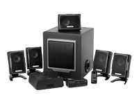 | Tipo de producto | Sistema de altavoces de cine en casa multimedia para PC inalámbrico | Color incluido | Negro | Color de la rejilla | Metálico | | Componentes del sistema | Transmisor, receptor, 5 altavoces, subwoofer | Tipo de altavoces | Activa | Potencia nominal de salida (Total) | 310 vatios | Ancho de banda de respuesta | 35 - 20000 Hz | Relación Señal a ruido | 85 dB | Certificación THX | Sí | Amplificador de sonido | Integrado | Tecnología de conectividad | Inalámbrico | Controles | Control de volumen posterior, control de volumen central, encendido/apagado, volumen, agudos, graves | Rejillas desmontables | Sí | Detalles del sistema de altavoces | | | Altavoces incluidos | 2 x altavoz del canal derecho/izquierdo - 36 vatios - cableado ¦ 2 x altavoz del canal posterior derecho/izquierdo - 36 vatios - inalámbrico ¦ 1 x altavoz del canal central - 36 vatios - cableado ¦ 1 x subwoofer - 130 vatios - cableado | Detalles del controlador | Altavoz satélite : 1 - 3" | Detalles del controlador | Subwoofer : 1 x controlador de subwoofer - 8" | | Tipo de conector | 1 x entrada de línea de audio del canal 5.1 digital ¦ 1 x auriculares ( miniteléfono estéreo 3.5 mm ) ¦ 1 x entrada de SPDIF | | Cables incluidos | 5 x cable de altavoz - 3 m ¦ 4 x cable de audio | Accesorios incluidos | Bases para altavoces, cable de alimentación | Control remoto | Mando a distancia - rayos infrarrojos | Características del mando a distancia | Control de volumen | | Dispositivo de alimentación | Fuente de alimentación | | Servicio y mantenimiento | 2 años de garantía | Detalles de Servicio y Mantenimiento | Garantía limitada - 2 años | | | |