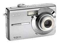 | Tipo de producto | Cámara digital - compacta | Anchura | 9.1 cm | Profundidad | 2.1 cm | Altura | 5.7 cm | Peso | 115 g | Color incluido | Plata | Características principales | | | Resolución | 7.0 Megapíxel | Colores admitidos | Color | Tipo sensor óptico | CCD | Total de píxeles | 7,400,000 pixels | Resolución efectiva del sensor | 7.200.000 píxeles | Tamaño del sensor óptico | 1/2.5" | Sensibilidad a la luz | ISO 100, ISO 800, ISO 400, ISO 200, ISO 64, ISO 1600, ISO automática (64-320) | Zoom digital | 5 x | Modos de toma de fotografías | Modo de cuadro de película | Programas de toma de fotografías | Horizontal, modo vertical, texto, acercamiento del primer plano, museo, luz posterior, retrato nocturno, autorretrato, Niños, fuegos artificiales, paisaje nocturno, panorámica, flor, modo de deportes, crepúsculo, vela, playa, nieve, antivibración, alta sensibilidad | Efectos especiales | Blanco y negro, Sepia | Velocidad máxima del obturador | 1/1400 seg | Velocidad mínima del disparador | 4 seg | Medición de exposición | Multisegmento, compensado en el centro, punto | Modos de exposición | Programa, automático | Compensación de exposición | ±2 rango de EV, en pasos EV de 1/3 | Compensación de blanco | Automático, preajustes | Preajustes de compensación de blanco | Fluorescente, luz de tungsteno, luz de día, sombra | Formato vídeo digital | QuickTime | Formato de imágenes fijas | JPEG | Captura de vídeo | QuickTime - 640 x 480 - 15 tramas por segundo ¦ QuickTime - 320 x 240 - 30 tramas por segundo | | Memoria flash soportada | MultiMediaCard, SD Memory Card, Tarjeta de memoria SDHC | Memoria integrada | 16 MB | Almacenamiento de imagen | JPEG 3072 x 2304 ¦ JPEG 3072 x 2048 ¦ JPEG 3072 x 1728 ¦ JPEG 2592 x 1944 ¦ JPEG 2048 x 1536 ¦ JPEG 1800 x 1200 ¦ JPEG 1920 x 1080 ¦ JPEG 1280 x 960 | | Flash de cámara | Flash incorporado | Modos de flash | Modo suplente, modo automático, modo de flash apagado, reducción del efecto de ojos rojos | Reducción de ojos rojos | Sí | Rango efectivo del flash | 0.6 m - 3.5 m | | Tipo | Objetivo zoom - f/2.8-5.1 | Distancia focal equivalente a la de una cámara de 35mm | 34 - 102mm | Ajuste de foco | Automático | Foco automático | Detección de contraste TTL | Puntos focales automáticos (zonas) | 5 | Distancia focal mínima | 60 cm | Rango de enfoque macro | 10-70cm | Apertura de la lente | F/2.8-5.1 | Zoom óptico | 3 x | Ajuste de zoom | Unidad motorizada | Características | Cubierta de lente incorporada, lente de forma esférica imperfecta | Características adicionales | | | Temporizador automático | Sí | Demora del temporizador automático | 10 segundos, 2 segundos | Características adicionales | Compatibilidad USB 2.0, ahorro automático de energía, impresión de fecha y hora, control de brillo de la pantalla, control de nitidez, detección de orientación de la cámara, soporte de PictBridge, estabilización de imagen digital, control de saturación, modo panorámico 16:9, detección facial | | Tipo | Display LCD - matriz activa TFT - 2.7" - color | Factor de forma de la pantalla | Incorporada | Formato de pantalla | 230.000 píxeles | | Tipo de conector | 1 x vídeo compuesto/salida de audio ¦ 1 x USB ¦ 1 x estación de acoplamiento ¦ 1 x entrada de corriente continua | Ranura(s) de expansión | 1 x Tarjeta de memoria SD | | Software | Controladores y utilidades, Kodak EasyShare | | Accesorios incluidos | Módulo de inserción a la estación de acoplamiento, muñequera | Cables incluidos | 1 x cable USB | | Dispositivo de alimentación | Adaptador de corriente - externa | | Batería soportada | Kodak KLIC 7001 | Detalles de batería soportados | 1 x Kodak KLIC 7001 batería recargable de ion-litio ( Incluido ) | | Servicio y mantenimiento | 1 año de garantía | Detalles de Servicio y Mantenimiento | Garantía limitada - 1 año | | | |