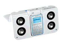 | Tipo de producto | Altavoces portátiles con base para reproductor digital | Anchura | 18.8 cm | Profundidad | 4.7 cm | Altura | 10.8 cm | Peso | 0.5 kg | | Tipo de altavoces | Activa | Potencia nominal de salida (Total) | 8 vatios | Ancho de banda de respuesta | 150 - 20000 Hz | Relación Señal a ruido | 75 dB | Protección antimagnética | Sí | Amplificador de sonido | Integrado | Controles | Encendido/apagado, volumen | Detalles del sistema de altavoces | | | Altavoces incluidos | 2 x altavoz del canal derecho - 4 vatios - 150 - 20000 Hz - cableado | Detalles del controlador | Altavoz del canal derecho/izquierdo : 2 x reforzador de la gama completa de frecuencias - 1.5" - titanio | | Tipo de conector | 1 x auriculares ( miniteléfono estéreo 3.5 mm ) ¦ 1 x entrada de la línea de audio ( miniteléfono estéreo 3.5 mm ) ¦ 1 x USB | | Cables incluidos | 1 x cable de audio | Accesorios incluidos | Estuche portátil, antena de FM | Control remoto | Mando a distancia - rayos infrarrojos | | Dispositivo de alimentación | Adaptador de corriente - externa | Duración (hasta) | 25 hora(s) | | Tipo | Batería - tipo AA | Cantidad necesaria | 4 | Cant. incluida | 0 | | | |