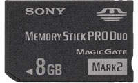 |  | Sweex SC016 antes 43 € ahora 30 € |  | Logitech K360 (920-003603) antes 39 € ahora 26 € |  | Teclado C3PO KBR-36 con lector y grabador de tarjetas inteligentes blanco USB (KBR36) outlet últimas unidades antes 57 € ahora 21 € |  | A-data AD3S1333B2G9-S antes 34 € ahora 23 € |  | Ratón móvil óptico HP USB (XQ500AA) antes 22 € ahora 15 € | | | | |  | Descripción Memory Stick Pro Duo 8 GB - ideal para almacenar, compartir y transferir miles de imágenes, vídeos y música de alta calidad - Con adaptador estándar incluido. - Ideal para grabación de vídeo de alta resolución. - Gran resistencia: 5 años de garantía. - Compatible con todas las Sony Cyber-shot, Handycam, VAIO, PSP y Alpha en el mercado desde 2007. - Compatible con tecnología de protección de copyright ("MagicGate"). | Características técnicas | | Referencia | Sony MSMT8G | | "Plug and play" | Sí | | Memoria interna | 8192 MB | Tipo de tarjeta flash | Memory Stick PRO Duo | Velocidad de escritura | 32 MB/s | Velocidad de transferencia | 160 MB/s | | Dimensiones (Ancho x Profundidad x Altura) | 31 x 1.6 x 20 mm | Peso | 2 g | | Voltaje de entrada | 2.7 - 3.6 V | | Alcance de temperatura operativa | -25 - 85 °C | | Color de producto | Negro | | | |