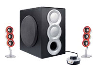 | Tipo de producto | Sistema de altavoces multimedios para PC | Dimensiones (AxPxH) / Peso | Altavoz satélite : 6 cm x 8.4 cm x 18.9 cm / 0.35 kg ¦ Subwoofer : 18 cm x 26.8 cm x 31 cm / 4.2 kg | Color incluido | Rojo | | Componentes del sistema | 2 altavoces, subwoofer | Tipo de altavoces | Activa | Potencia nominal de salida (Total) | 41 vatios | Ancho de banda de respuesta | 30 - 20000 Hz | Relación Señal a ruido | 80 dB | Amplificador de sonido | Integrado | Tecnología de conectividad | Cableado | Controles | Encendido/apagado, volumen, graves | Detalles del sistema de altavoces | | | Altavoces incluidos | 2 x altavoz satélite - 8.5 vatios - cableado ¦ 1 x subwoofer - 24 vatios - cableado | Detalles del controlador | Altavoz satélite : 3 x reforzador de la gama completa de frecuencias - titanio ¦ Subwoofer : 1 x controlador de subwoofer | | Tipo de conector | 2 x entrada de la línea de audio ( miniteléfono estéreo 3.5 mm ) ¦ 1 x auriculares ( miniteléfono estéreo 3.5 mm ) | | Cables incluidos | 1 x cable de audio - 2 m ¦ 1 x cable de audio - 0.5 m | Control remoto | Mando a distancia - cable | | Dispositivo de alimentación | Adaptador de corriente - externa | | | |