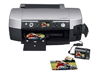 | Tipo de impresora | Impresora de fotos - chorro de tinta - color | Anchura | 48.3 cm | Profundidad | 30 cm | Altura | 18.8 cm | Peso | 5.4 kg | | Tecnología de inyección de tinta | Epson Micro Piezo | Paleta de tinta admitida (colores) | 6 tintas - cian, magenta, amarillo, negro, cian claro, magenta claro | Configuración de boquilla | Boquillas de 6 x 90 | Tamaño mínimo de gota de tinta | 3 pl | Velocidad de impresión | Hasta 15 ppm - impresión en negro calidad borrador - A4 (210 x 297 mm) ¦ Hasta 15 ppm - impresión en color calidad borrador - A4 (210 x 297 mm) ¦ Hasta 0.95 minutos/página - foto - 100 x 150 mm | Dispositivos incorporados | Pantalla de vista previa | Tamaño de pantalla de vista previa | 2.4" | Tecnología de conectividad | Cableado | Interfaz | USB | Resolución máxima (B/N) | 5760 ppp x 1440 ppp | Resolución máxima (color) | 5760 ppp x 1440 ppp | Impresión de CD/DVD | Sí | Especificaciones de impresión directa | PictBridge, DPOF | Simulación idioma | EPSON ESC/P 2 | Opciones de la impresora | Impresión a sangre, impresión de CD/DVD | | Tipo | Lector de tarjetas | Tarjetas de memoria flash compatibles | Tarjeta CompactFlash tipo I, Tarjeta CompactFlash tipo II, Palanca de memoria, Memory Stick PRO, Microdrive, MultiMediaCard, SD Memory Card, SmartMedia Card, Memory Stick Duo, xD-Picture Card | | Tipo de soporte | Sobres, papel normal, papel fotográfico brillante , papel fotográfico semisatinado, papel de fotografía satinado, Compact Disk, papel mate grueso y resistente | Tamaño soporte | ANSI A (Letter) (216 x 279 mm), Legal (216 x 356 mm), Executive (184 x 267 mm), A4 (210 x 297 mm), A5 (148 x 210 mm), B5 (176 x 250 mm), A6 (105 x 148 mm), 203 x 254 mm, 101.6 x 152.4 mm, 127 x 178 mm | Tamaño sobres | US No 10 (104.7 x 241.3 mm), International DL (110 x 220 mm), International C6 (114 x 162 mm) | Tamaño tarjeta/etiquetas | US 4 x 6 Card (10 x 15 cm), US 10 x 8 Card (254.0 x 203.3 mm) | Anchura máxima de impresión | 216 mm | Capacidad total del material | 120 hojas | Alimentador/es soporte | 1 x carga automática - 120 hojas | | Total ranuras de expansión (libres) | 1 ( 1 ) x Tarjeta CompactFlash - tipo I/II ¦ 1 ( 1 ) x Tarjeta de memoria SD ¦ 1 ( 1 ) x xD-Picture Card ¦ 1 ( 1 ) x Tarjeta SmartMedia ¦ 1 ( 1 ) x Memory Stick PRO | Conexiones | 1 x Hi-Speed USB - 4 PIN USB tipo B ¦ 1 x puerto de impresión directa - USB - 4 PIN USB tipo A | | Cumplimiento de normas | Certificado FCC Clase B , UL 1950, CSA 22.2 No. 950, FCC Part 15 B | | Frecuencia requerida | 60 Hz | Consumo eléctrico en funcionamiento | 13 vatios | Software / Requisitos del sistema | | | Sistema operativo requerido | Apple MacOS 9.1 o posterior, Apple MacOS X 10.2 o posterior, Microsoft Windows 98SE/2000/ME/XP | | | |