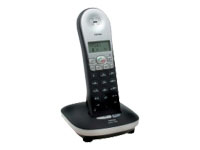| Tipo de producto | Teléfono inalámbrico con identificación del abonado que llama | Características del teléfono | | | Estándar para teléfonos inalámbricos | DECT | Cantidad máxima de auriculares soportada | 4 | Distancia máxima de funcionamiento del auricular | 50 m | Distancia máxima de funcionamiento del auricular (exteriores) | 300 m | Tipo de mecanismo de marcación | Teclado | Ubicación del mecanismo de marcación | Auricular | Modos de marcación | Pulso, tono | Capacidad de llamadas en conferencia | Sí | Interfono | Sí | Teléfono con altavoz | Sí | Identificación de llamadas | Sí | Capacidad de correo de voz | Sí | Transferencia de llamada | Sí | Operación del menú | Sí | Botones de funciones | Botón del altavoz del teléfono, botón de directorio, botón de intercomunicación, botón de flash, botón de memoria y pausa, botón del silenciador del auricular, botón de remarcación | Control de volumen | Sí | Control del timbre | Sí | Timbre polifónico | Sí | Posicionador del microteléfono | Sí | Características adicionales | Alerta de fuera de alcance, bloqueo del teclado | | Capacidad de la guía de teléfonos | 50 nombres y números | Memoria de llamadas realizadas | 3 | | Tipo | Pantalla de cristal líquido - monocromo | Ubicación de la pantalla | Auricular | Información de la pantalla | Estado de la batería, estado del mensaje, manos libres, bloqueo de microteléfono | Características | Alumbrado de fondo | | Antena | Integrado | | Tipo | Adaptador de corriente - externo | | Batería | 2 x baterías - tipo AAA | Capacidad | 600 mAh | Tecnología | Recargable - NiMH | Tiempo de conversación | Hasta 660 minutos | Tiempo en espera | Hasta 100 horas | | | |
