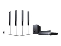 | Tipo de producto | Sistema de cine en casa | | Componentes | Reproductor de DVD/ receptor AV, sistema de altavoces | Modo de salida del sonido | Sonido envolvente | Decodificadores incorporados | Dolby Pro Logic, Dolby Pro Logic II, Dolby Digital, Decodificador DTSDTS | Efectos de sonido | Intensificación de graves | Clase de sistema envolvente | 5.1 canales | Total / Potencia de salida | 1200 vatios | Detalles de salida del amplificador | 143 vatios - DAT 10% - 2 canal/es ( posterior ) ¦ 143 vatios - DAT 10% - 1 canal/es ( central ) ¦ 285 vatios - DAT 10% - 1 canal/es ( subwoofer ) ¦ 143 vatios - DAT 10% - 2 canal/es ( frontal ) | Reloj incorporado | Temporizador de apagado automático | Temporizador | Desconexión | Atenuador de pantalla | Sí | Características adicionales | Calibración automática de sonido, Digital Infrared Audio Transmission (DIAT), canal envolvente inalámbrico | | Enchufe hembra para audífonos | Sí | Entrada digital coaxial | Sí | Entrada digital óptica | Sí | | Altavoz/altavoces | 2 x altavoz del canal derecho/izquierdo - externo - cableado ¦ 1 x altavoz del canal central - externo - cableado ¦ 2 x altavoz del canal posterior derecho/izquierdo - externo - inalámbrico ¦ 1 x subwoofer - externo - cableado | | Tipo | Sintonizador de radio - AM/FM - sintonizador digital de radio | Nº de emisoras presintonizadas | 30 emisoras presintonizadas | Cant. de estaciones de AM preestablecidas | 10 emisoras presintonizadas | Cant. de estaciones de FM preestablecidas | 20 emisoras presintonizadas | Factor de forma de la antena | Antena de cuadro para AM / antena de hilos para FM | Funciones RDS admitidas | PS | | Tipo | Lector de DVD | Formato soporte | CD-R, CD-RW, DVD-R, DVD+RW, DVD-RW, DVD+R, DVD, CD, CD de vídeo, DVD+R DL, DVD-R DL | Convertidor digital/analógico de vídeo | 12bit / 108MHz | Convertidor digital/analógico de audio | 24bit / 48kHz | Reproducción de MP3 | Sí | Estándares de audio digital soportados | MP3 | Escalado ascendente | Sí | Resolución de salida | 1080i, 720p | Características | Exploración progresiva, reproducción de fotos JPEG | | Tipo | Mando a distancia - rayos infrarrojos | | Tipo de conector | 1 x auriculares ( miniteléfono estéreo 3.5 mm ) - frente ¦ 1 x entrada de la línea de audio ( miniteléfono estéreo 3.5 mm ) - frente ¦ 1 x entrada de SPDIF ( TOSLINK ) - posterior ¦ 1 x entrada de SPDIF ( RCA fono ) - posterior ¦ 1 x SCART ( 21 PIN SCART ) - posterior ¦ 1 x salida HDMI ( HDMI de 19 espigas del tipo A ) - posterior ¦ 1 x salida de vídeo componente ( Fono RCA x 3 ) - posterior ¦ 1 x entrada de la línea de audio ( RCA fono x 2 ) - posterior | | Accesorios incluidos | Micrófono de calibración automática | | Dispositivo de alimentación | Fuente de alimentación - interna | | | |