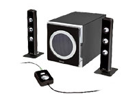 | Tipo de producto | Sistema de altavoces multimedios para PC | | Componentes del sistema | Unidad de control, 2 altavoces, subwoofer | Potencia nominal de salida (Total) | 45 vatios | Tecnología de conectividad | Cableado | | Tipo de conector | Entrada de la línea de audio ( miniteléfono estéreo 3.5 mm ) | | Accesorios incluidos | Base | Control remoto | Mando a distancia - cable | | Dispositivo de alimentación | Fuente de alimentación - interna | Voltaje necesario | CA 230V | | Servicio y mantenimiento | 2 años de garantía | Detalles de Servicio y Mantenimiento | Garantía limitada - 2 años | | | |